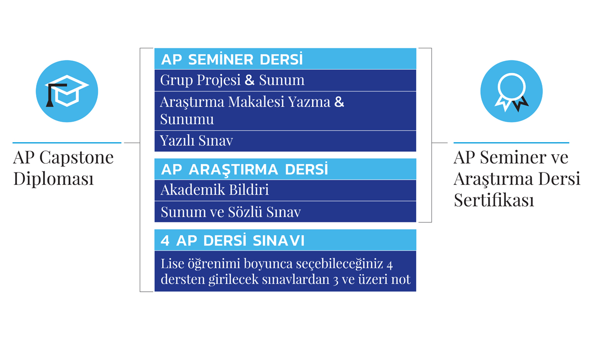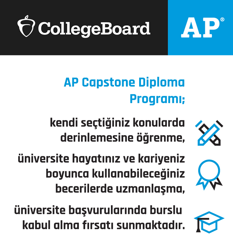 AP Capstone™ Diploma Programı üniversite düzeyinde araştırma, iş birliği, iletişim becerilerini geliştirmeye olanak sağlayan yenilikçi bir diploma programıdır. Bu program kapsamında öğrenciler, her biri 1 akademik yıl sürecek olan AP Seminar (Seminer) ve AP Research (Araştırma) derslerini almalıdır. Bu diploma programını tamamlamak için öğrencilerin lise öğrenimi boyunca AP Seminer ve AP Araştırma derslerinden farklı olarak 4 farklı AP dersi sınavından 3 ve üzeri not alması beklenmektedir.