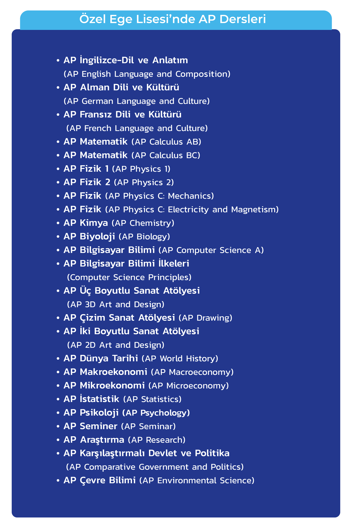 Özel Ege Lisesi olarak lise seviyesindeki öğrencilerimize lisans düzeyinde 2021-2022 öğretim yılı itibarıyla 25 AP dersi vermekteyiz. Bu dersler aynı zamanda MEB Talim ve Terbiye Kurulu onayıyla Özel Ege Lisesi müfredatında yer aldığından öğrencilerimizin karne ve transkriptlerinde de görülmektedir. Ayrıca Özel Ege Lisesi AP ve SAT sınav merkezi de olduğu için öğrencilerimiz AP ve SAT sınavlarına okulumuzda girme hakkına sahiptir.