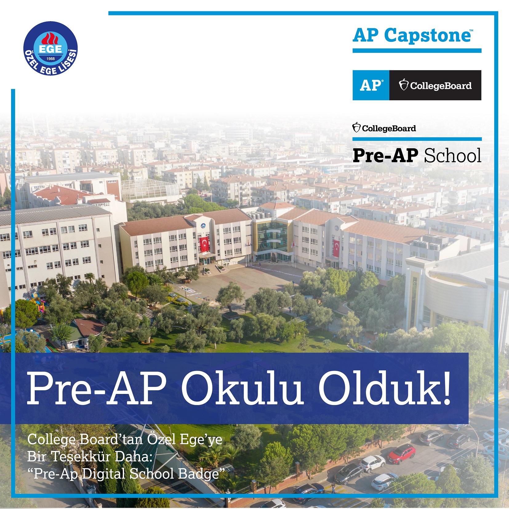 2013 yılından bu yana sürdürdüğü AP (Advanced Placement) Programı deneyimine 2021 Şubat ayı itibarıyla AP Capstone™ Diploma Programı’nı da dâhil etmiş olan Özel Ege Lisesi, 2021-2022 akademik yılında başladığı Pre-AP programı kapsamında yürüttüğü başarılı çalışmalar ile ilgili olarak "Dijital Okul Rozeti (Pre-AP Digital School Badge)" almaya hak kazandı. 8. Sınıf öğrencilerimiz Pre-AP sınavlarında Amerika Birleşik Devletleri’nde öğrenim gören 9. ve 10. Sınıf öğrencilerinin 8 doğru cevap ortalamasını aşarak üstün başarı elde etti.