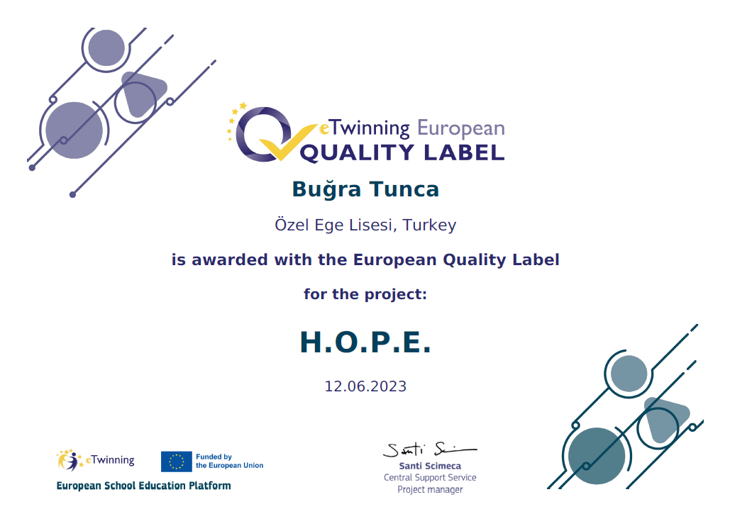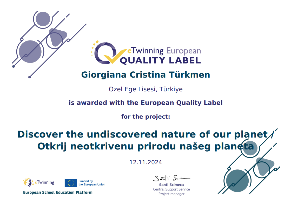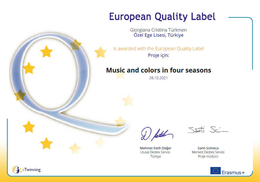 Birinci sınıf öğrencilerimiz ile yıl boyunca yürüttüğümüz eTwinning “Music and Colors in Four Seasons” projesi, eTwinning Türkiye Ulusal Destek Ekibi ve Millî Eğitim Bakanlığının desteklediği Yenilik ve Eğitim Teknolojileri Genel Müdürlüğü tarafından Avrupa Kalite Etiketi ile ödüllendirilmiştir.
