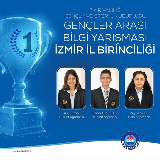 11. sınıf öğrencilerimiz Aslı Turan, Onur Umut Ulu ve Zeynep Gül, İzmir Valiliği Gençlik ve Spor İl Müdürlüğü tarafından düzenlenen Gençler Arası Bilgi Yarışması'nda İzmir il birincisi oldu.