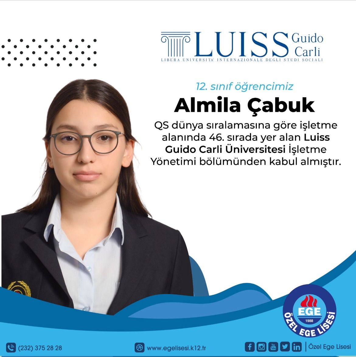 12. sınıf öğrencimiz Almila Çabuk, QS dünya sıralamasına göre işletme alanında 46. sırada yer alan Luiss Guido Carli Üniversitesinden kabul almıştır. Luiss Guido Carli Üniversitesi, yönetim ve sosyal bilimler alanında önde gelen özel üniversitelerden biridi