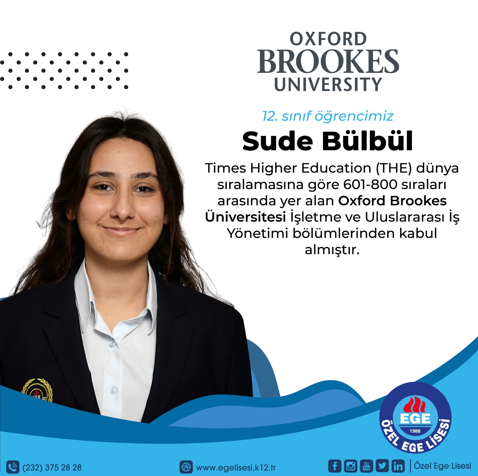 12.sınıf öğrencimiz Sude Bülbül, Times Higher Education (THE) dünya sıralamasına göre 601-800 sıraları arasında yer alan Oxford Brookes Üniversitesinin İşletme ve Uluslararası İş Yönetimi bölümlerinden ve 201-250 sıraları aras