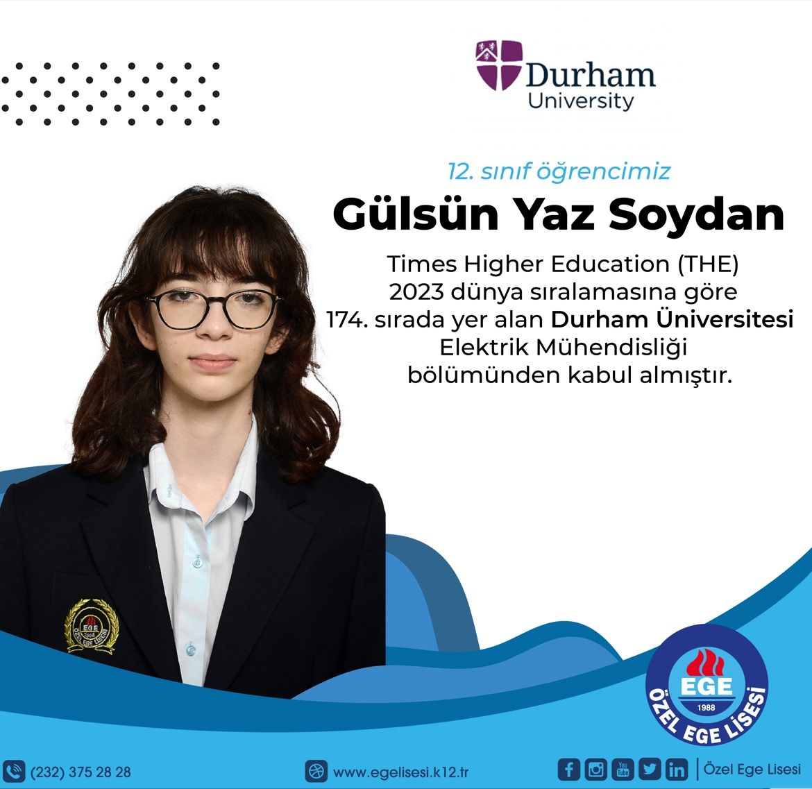 12. sınıf öğrencimiz Gülsün Yaz Soydan Times Higher Education dünya sıralamasına göre 174. sırada yer alan Durham Üniversitesi Elektrik Mühendisliği bölümünden, 177. sırada yer alan Ottawa Üniversitesi Elektrik Mühendis