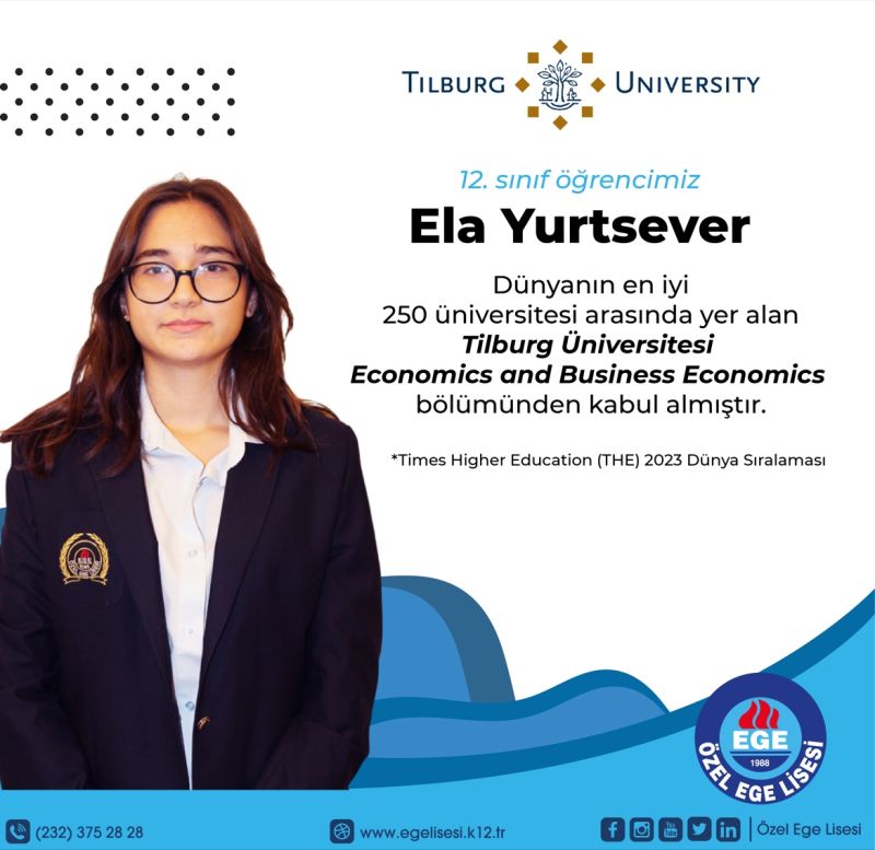 12. sınıf öğrencimiz Ela Yurtsever, 2023 yılında Times Higher Education (THE) tarafından dünyanın en iyi 250 üniversitesi arasında yer alan, ekonomi ve işletme alanında 40. sırada bulunan Tilburg Üniversitesi “Economics and Business Economics” bölümünden kabul alm