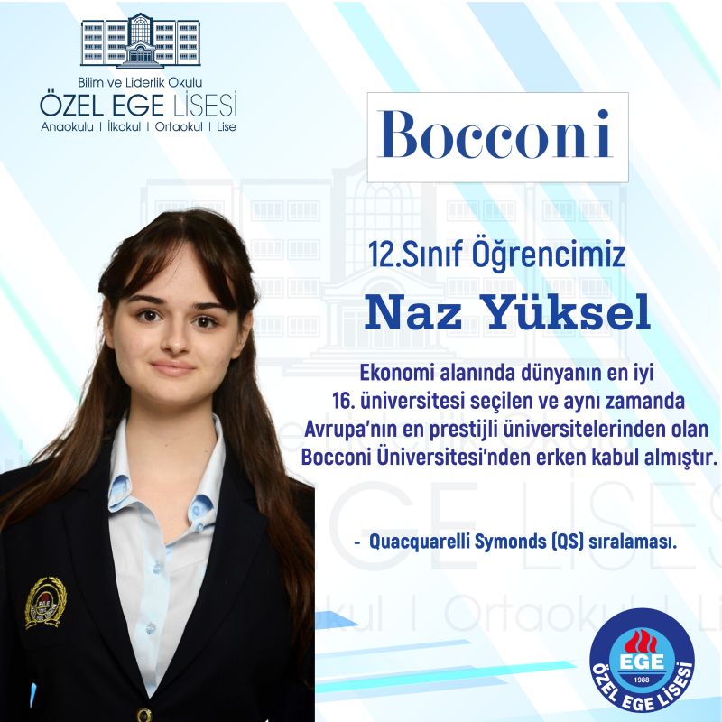 12. Sınıf öğrencimiz Naz Yüksel, Quacquarelli Symonds (QS) tarafından tarafından dünyanın en iyi 16. üniversitesi seçilen ve aynı zamanda Avrupa’nın en prestijli üniversitelerinden olan Bocconi Üniversitesi’nden kabul aldı.