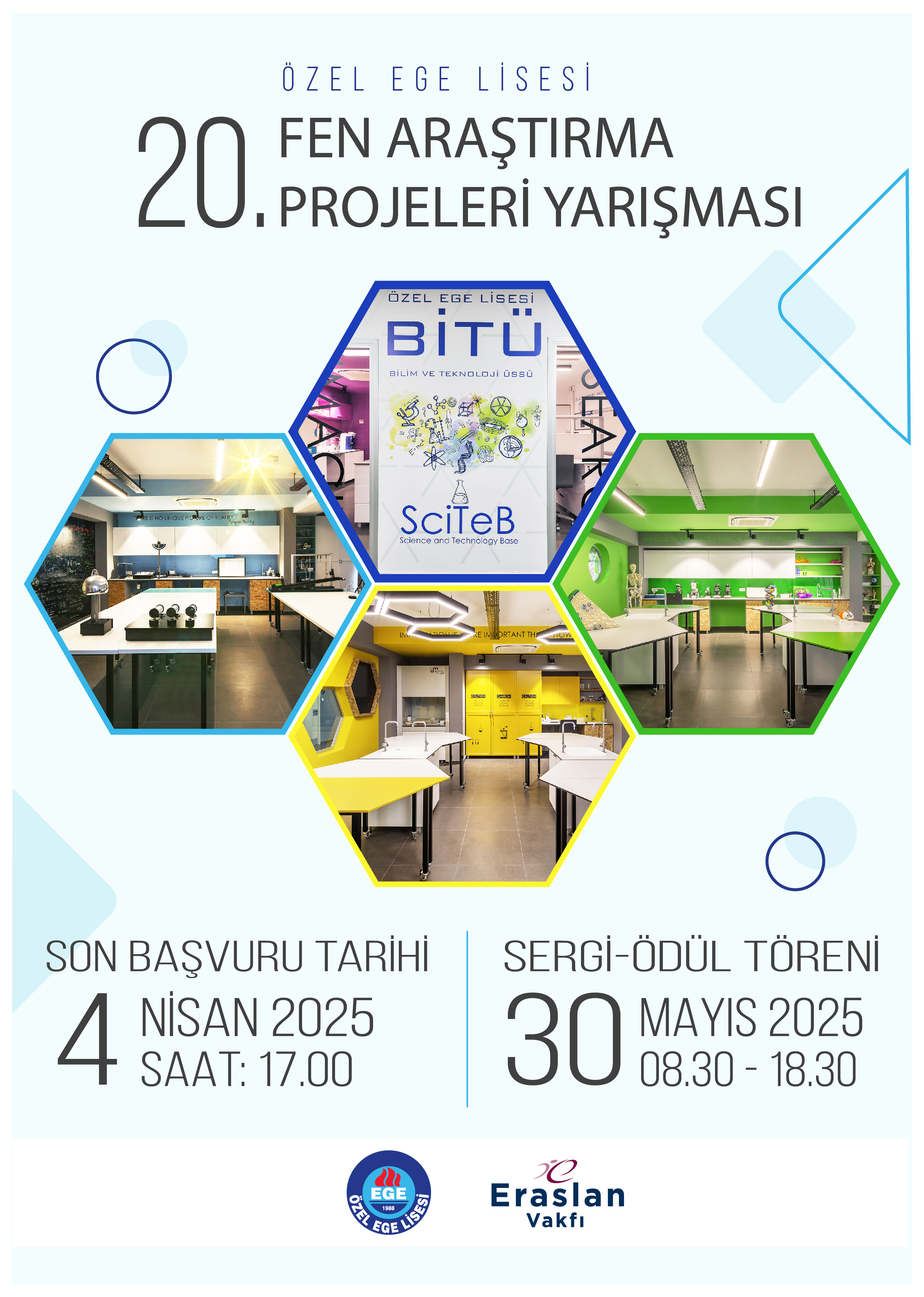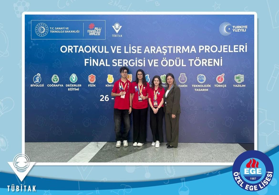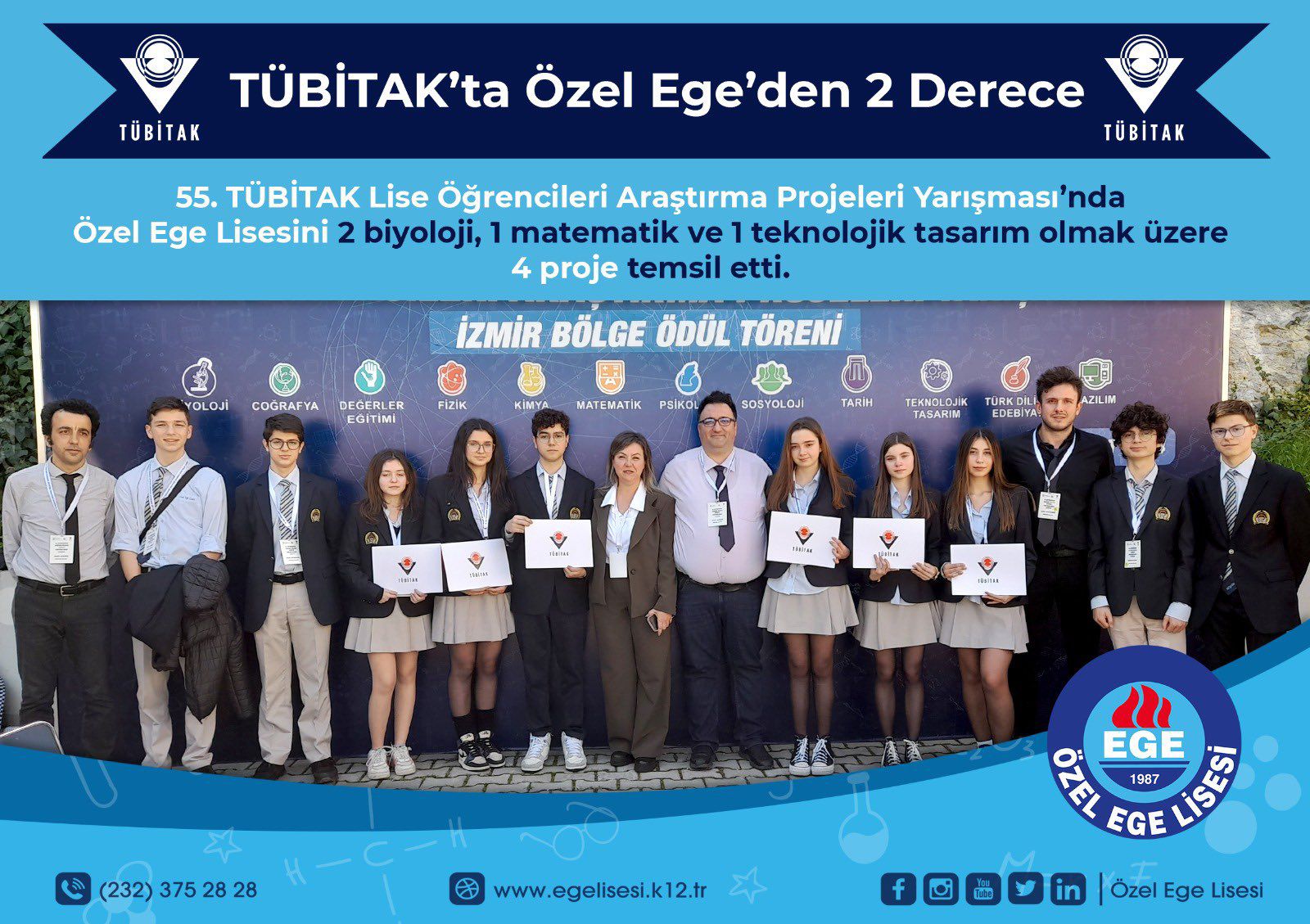 TÜBİTAK tarafından düzenlenen 55. TÜBİTAK Lise Öğrencileri Araştırma Projeleri Yarışması’nın sonuçları belli oldu. 4 – 7 Mart 2024 tarihleri arasında Kuşadası’nda gerçekleştirilen İzmir Bölge Yarışması’nda Özel Ege Lisesini 2 biyoloji, 1 matematik ve 1