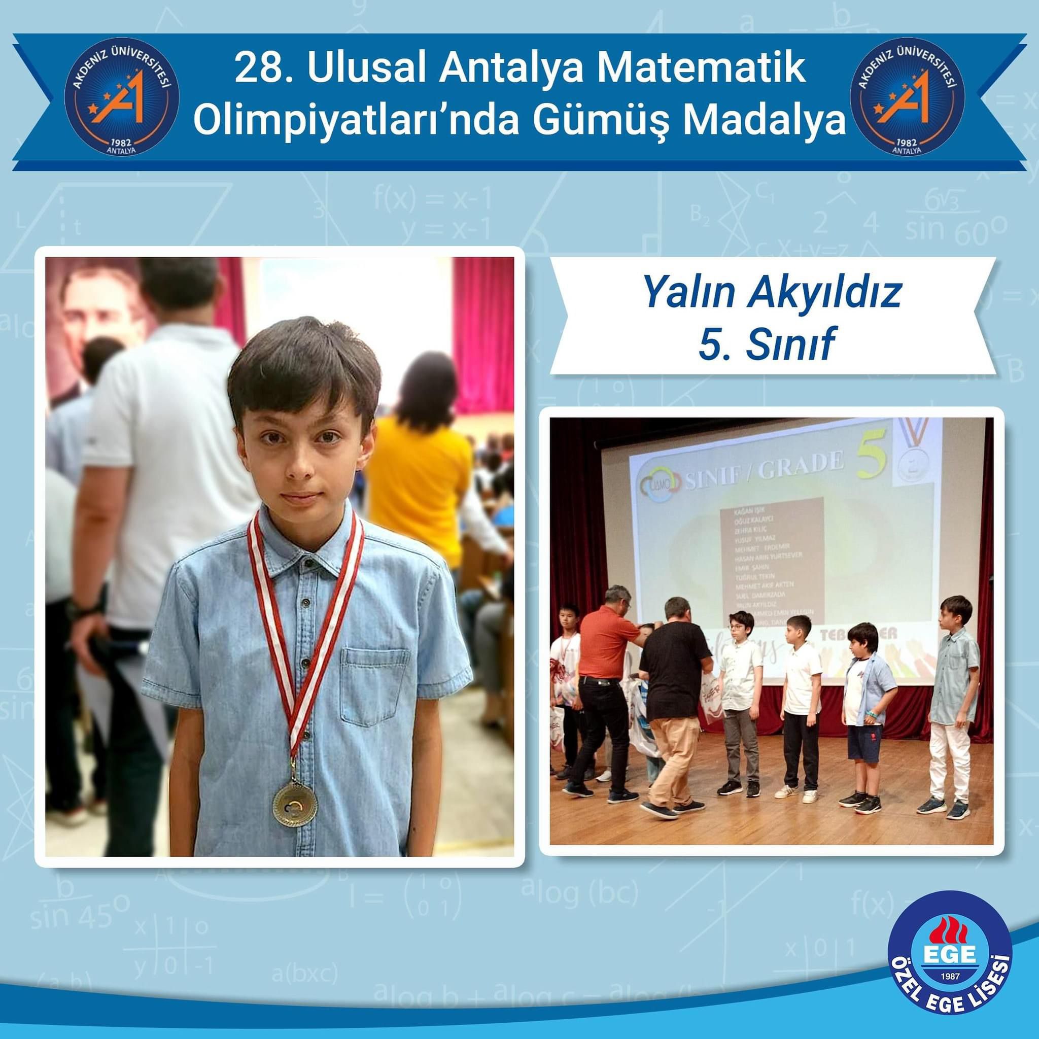 5.sınıf Öğrencimiz Yalın Akyıldız, Akdeniz Üniversitesi 28. Ulusal Antalya Matematik Olimpiyatları’nda gümüş madalya almaya hak kazanmıştır. Öğrencimizi tebrik eder, başarılarının devamın