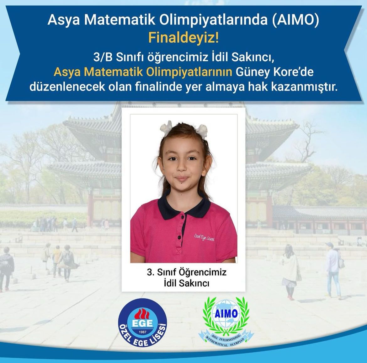 3-B sınıfı öğrencimiz İdil Sakıncı, Asya Matematik Olimpiyatlarının (AIMO) çevrim içi olan ilk aşamasında aldığı puan ile Güney Kore’de yapılacak finalde yer almaya hak kazanmıştır.