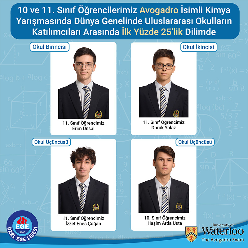 Okulumuz 10. ve 11. sınıf öğrencilerinden Aliye Derin Demirelli, Alara Nisa İzci, Su Karaağaç, Duru Şimşek, Efe Öztürk, Efe Tuna Galipoğlu, Ege Onar, Elif Kabadayı, Elif Naz Tatar, Nil Soykan, Arda Özsüer, Ural İsmail Uğurlu, Doruk Yalaz, Recep Efe Erez