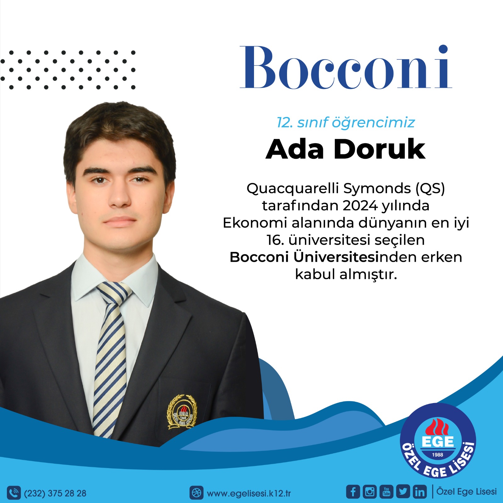 12. sınıf öğrencimiz Ada Doruk, Quacquarelli Symonds (QS) tarafından 2024 yılında ekonomi alanında dünyanın en iyi 16. üniversitesi seçilen Bocconi Üniversitesinden erken kabul almıştır. Özellikle ekonomi ve işletme alanlarında verdiği eğitim ve araş