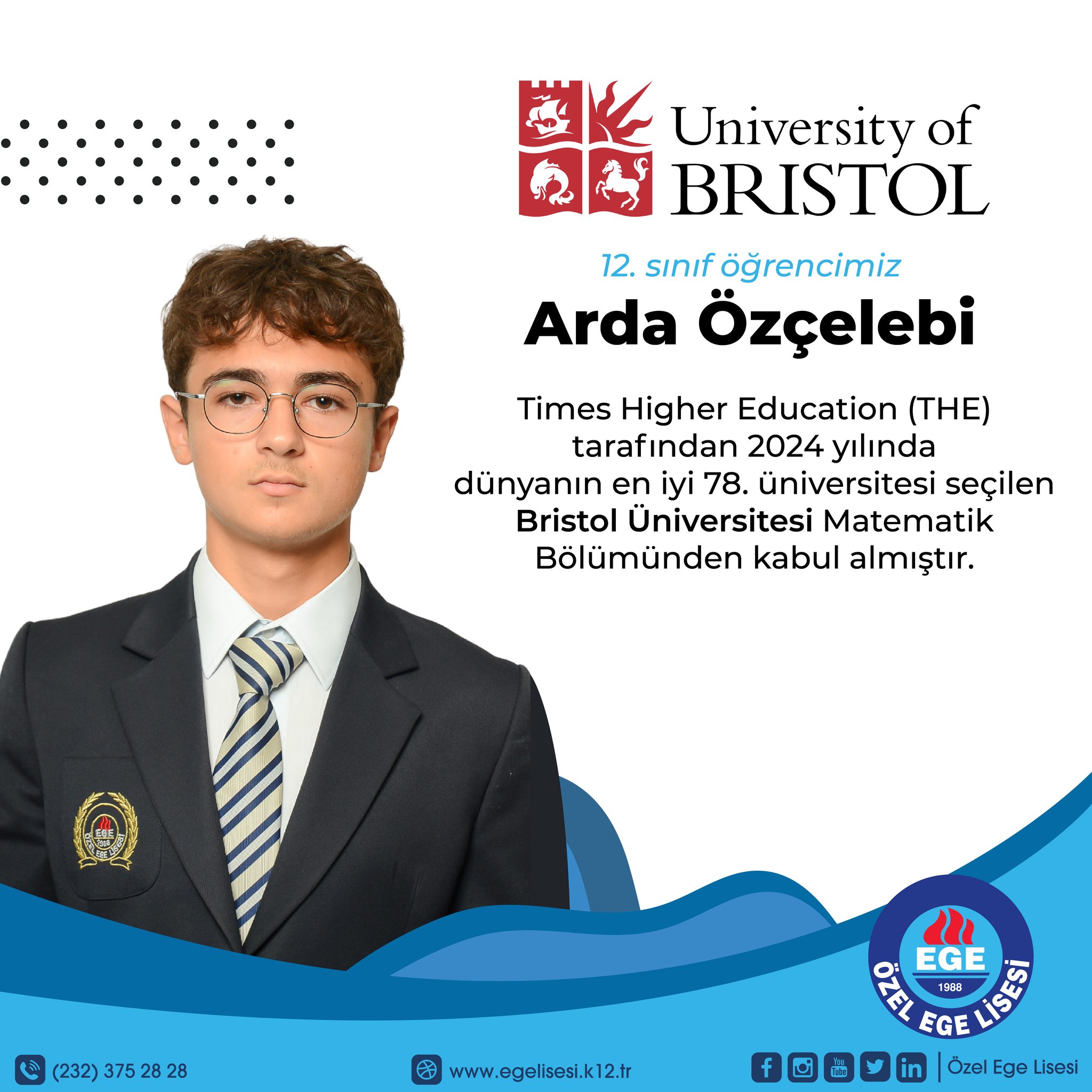 12. sınıf öğrencimiz Arda Özçelebi, Times Higher Education (THE) tarafından 2024 yılında dünyanın en iyi 78. üniversitesi seçilen Bristol Üniversitesinden kabul almıştır. Birleşik Krallık’ta araştırma odaklı en iyi üniversitele