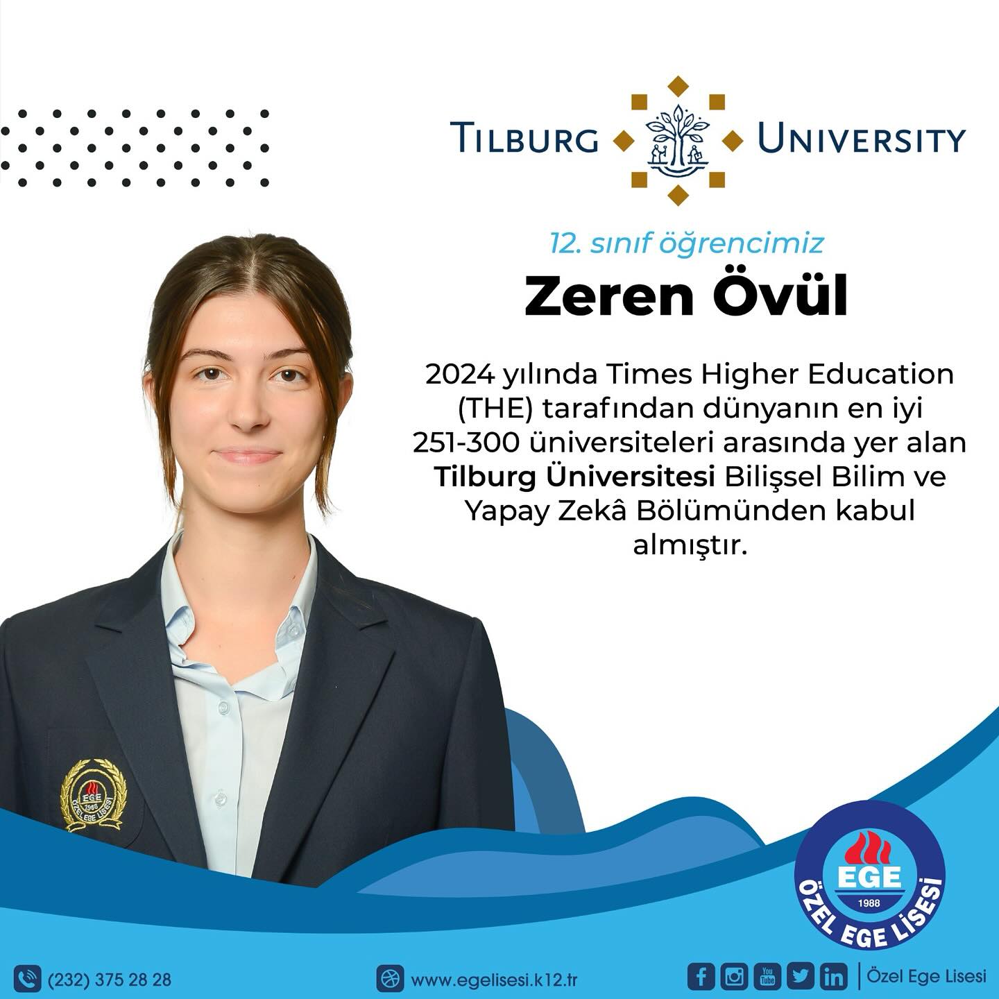 12. sınıf öğrencimiz Zeren Övül, 2024 yılında Times Higher Education (THE) tarafından dünyanın en iyi 251-300 üniversiteleri arasında yer alan Tilburg Üniversitesi Bilişsel Bilim ve Yapay Zekâ bölümünden kabul almıştır. Avrupa’nın önde gelen, prest