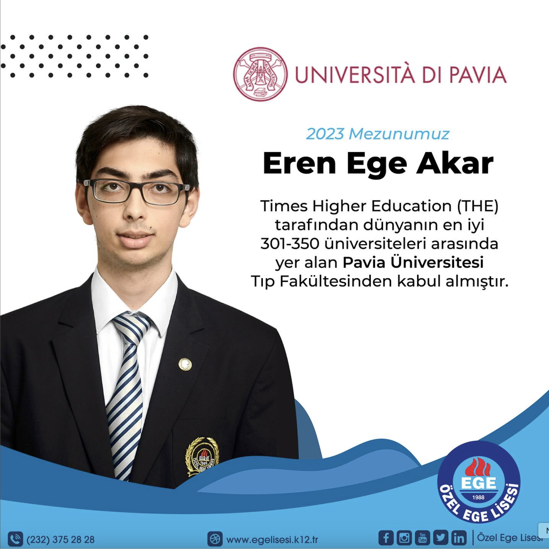 2023 mezunlarımızdan Eren Ege Akar, Times Higher Education (THE) tarafından dünyanın en iyi 301-350 üniversiteleri arasında yer alan Pavia Üniversitesi Tıp Fakültesinden kabul almıştır. 1361 yılında kurulan Pavia Üniversitesi (Unive