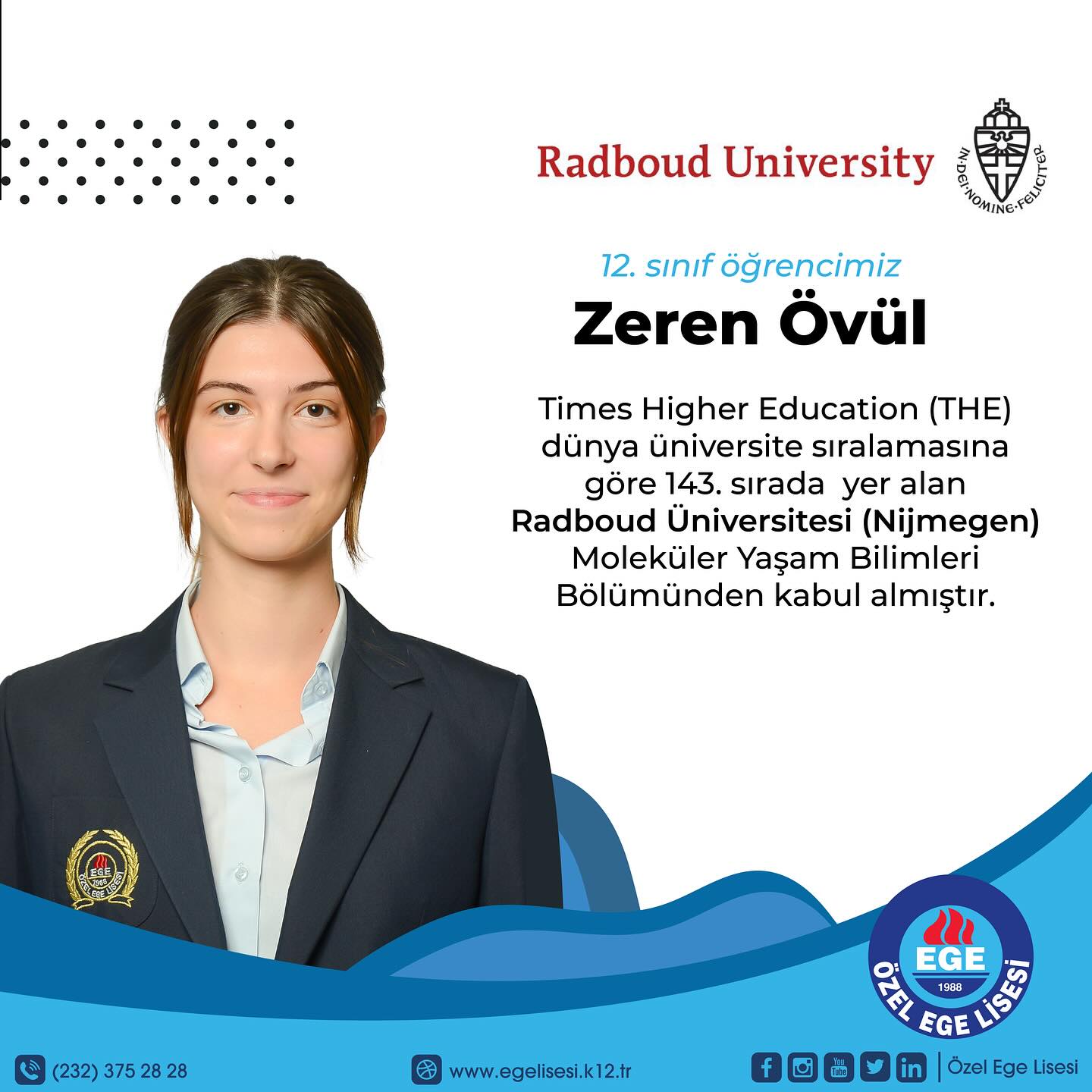 12. sınıf öğrencimiz Zeren Övül, Times Higher Education (THE) dünya üniversite sıralamasına göre 143. sırada yer alan Radboud Üniversitesinden (Nijmegen) kabul almıştır. Avrupa’daki araştırma odaklı 18 üniversitesinin 2016 yılında ku