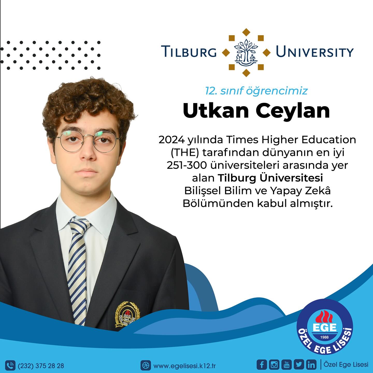 12. sınıf öğrencimiz Utkan Ceylan, 2024 yılında Times Higher Education (THE) tarafından dünyanın en iyi 251-300 üniversiteleri arasında yer alan Tilburg Üniversitesi Bilişsel Bilim ve Yapay Zekâ bölümünden kabul almıştır. Avrupa
