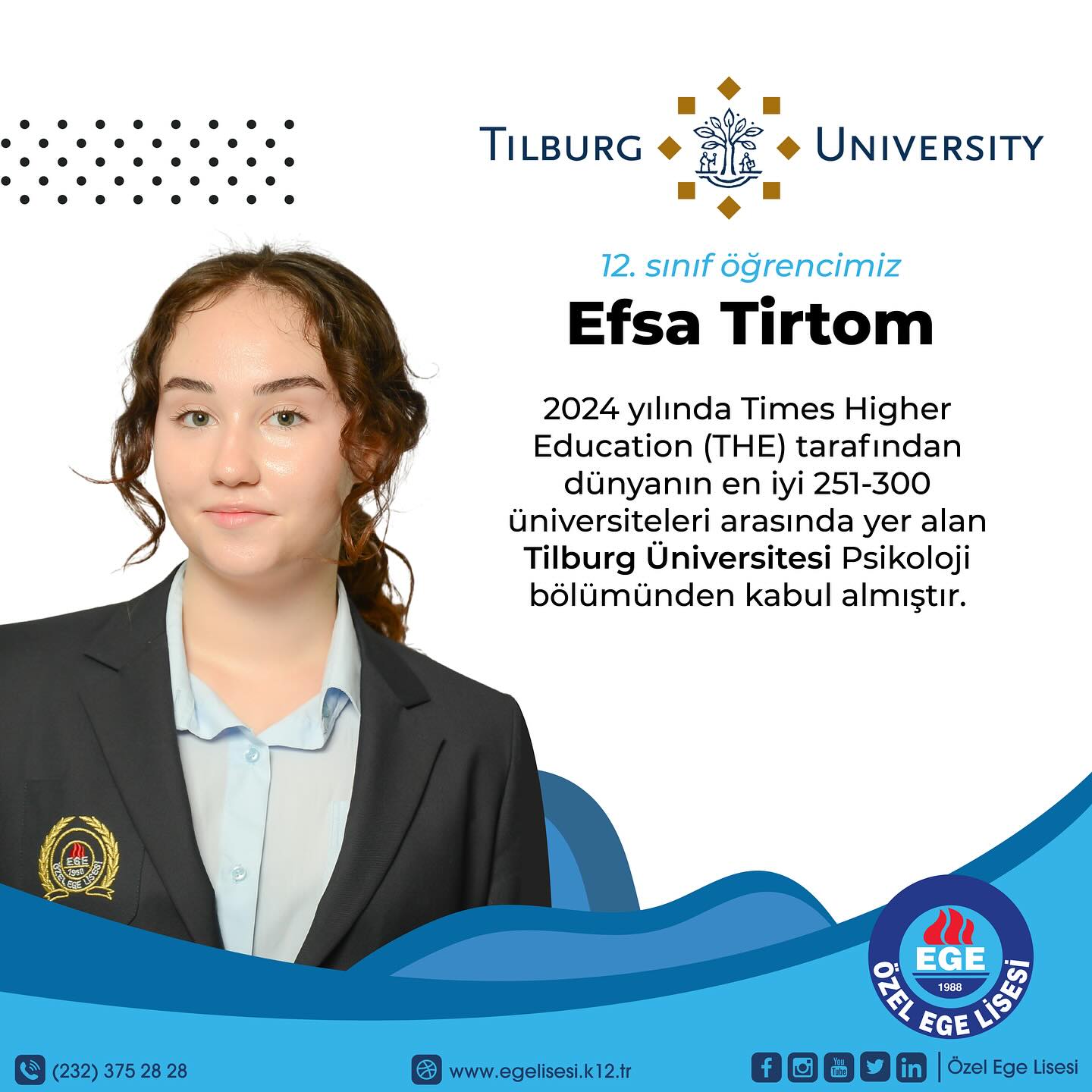 12. sınıf öğrencimiz Efsa Tirtom, 2024 yılında Times Higher Education (THE) tarafından dünyanın en iyi 251-300 üniversiteleri arasında yer alan ve psikoloji alanında dünya sıralamalarında 66. sırada bulunan Tilburg Üniversitesi Psikoloji bölümünden kabul a