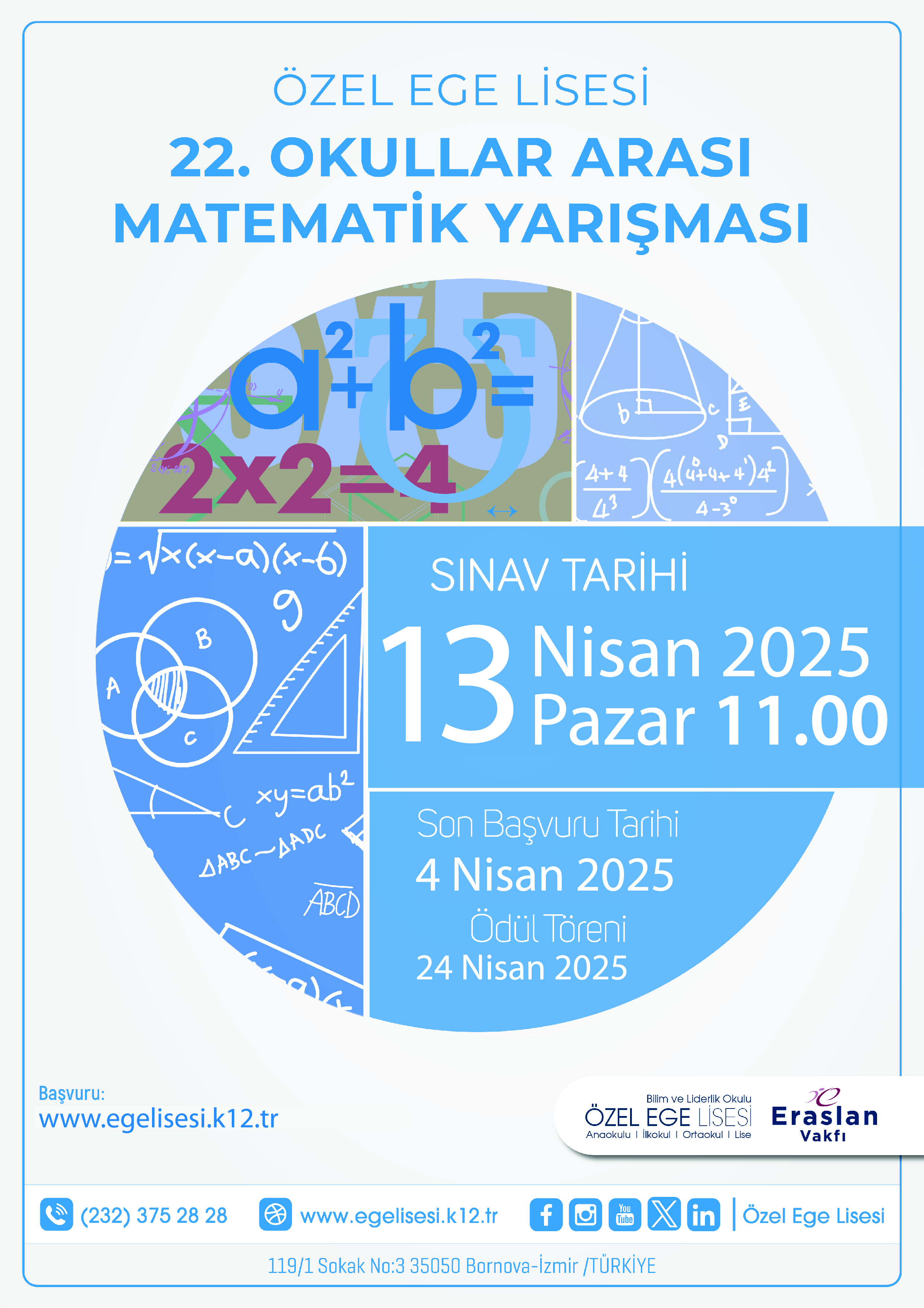 13 Nisan 2025 Pazar günü İzmir genelinde gerçekleştirilen "Özel Ege Lisesi 22. Okullar Arası Matematik Yarışması" sonuçları açıklandı. Sınav Sonucunuzu Öğrenmek İçin: