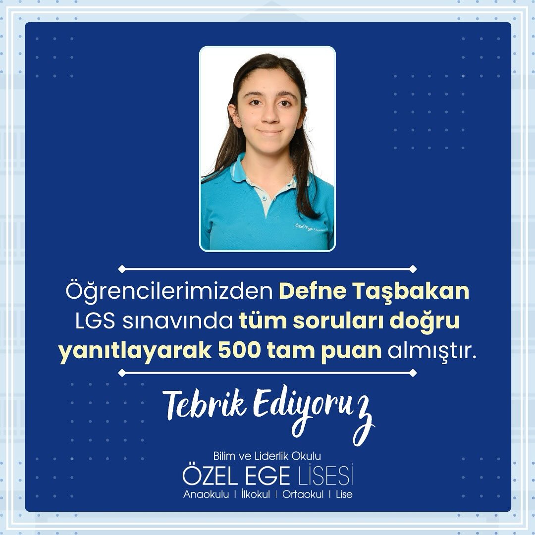 Öğrencilerimizden Defne Taşbakan LGS sınavında tüm soruları doğru yanıtlayarak 500 tam puan almıştır. Öğrencimiz Defne Taşbakanı’ı gönülden tebrik ederiz.