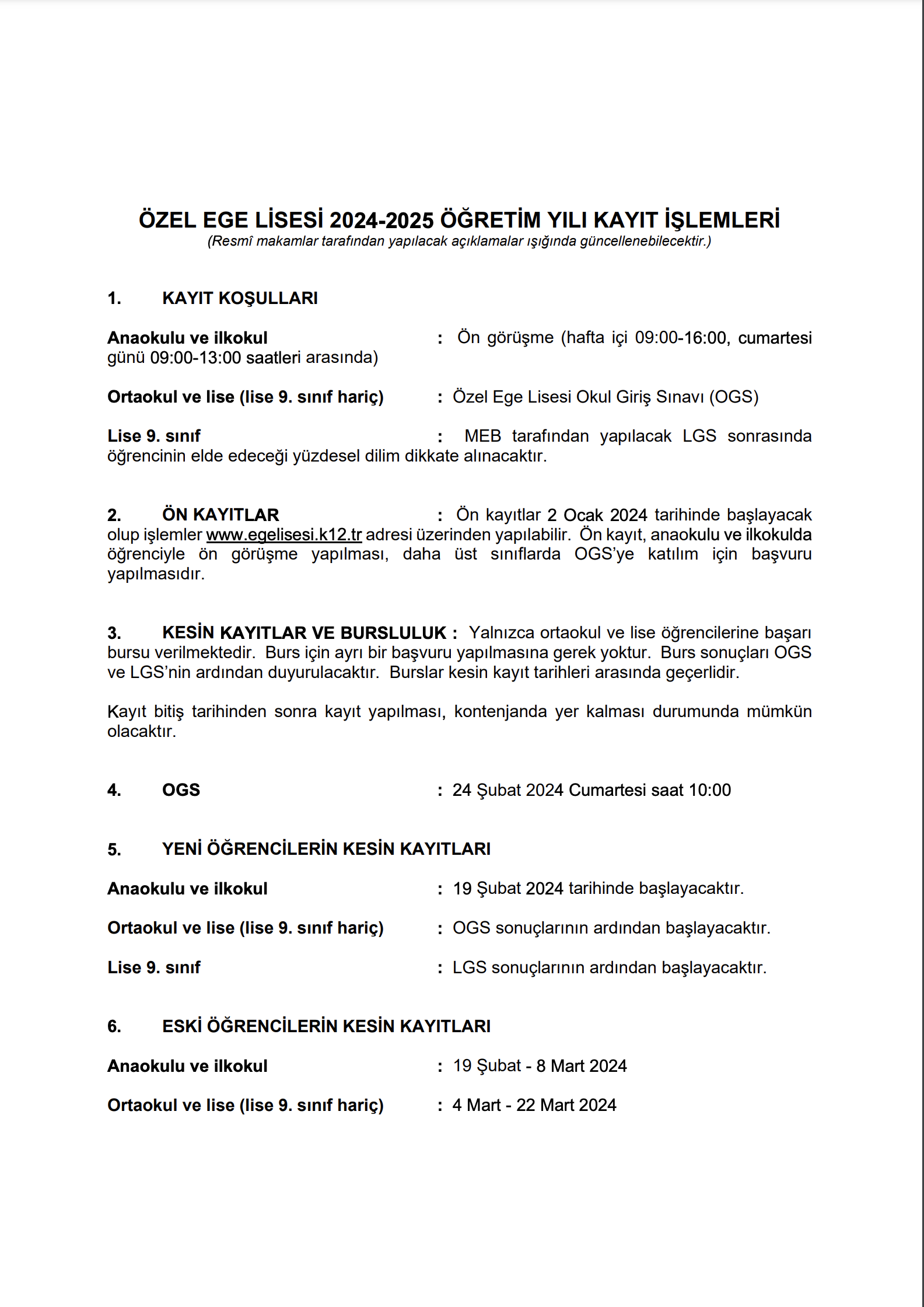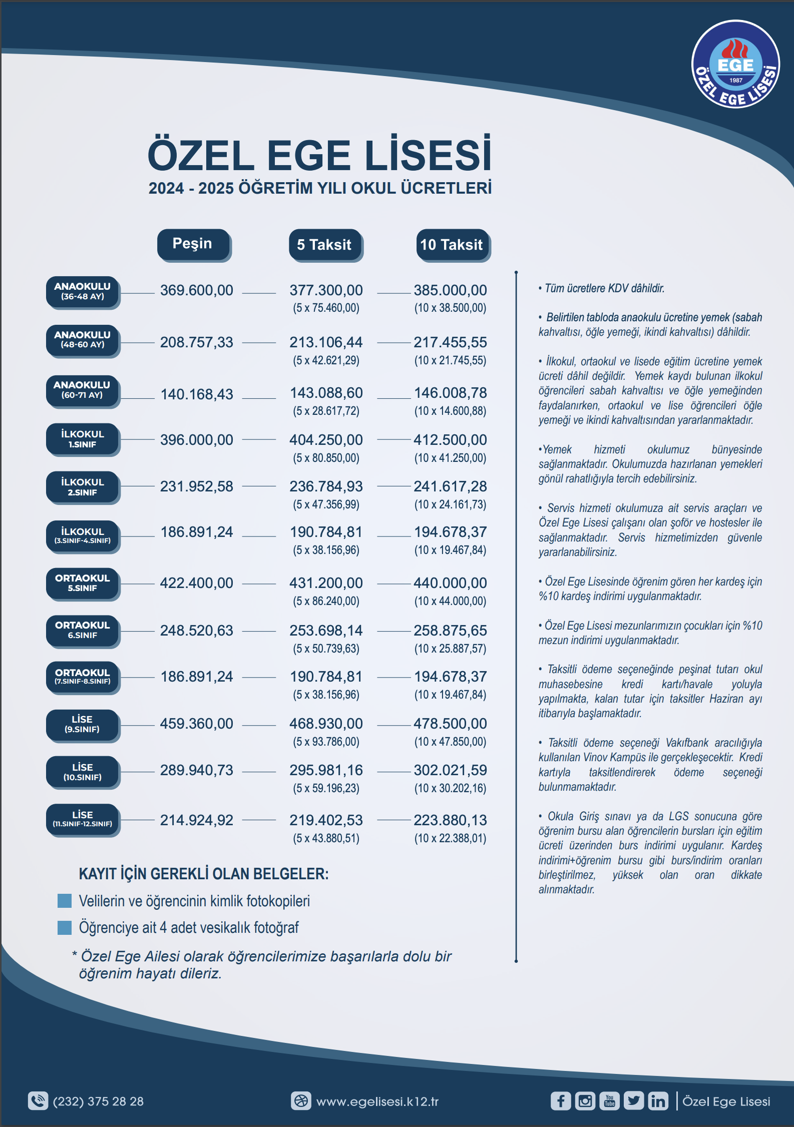 Özel Ege Lisesi 2025-2026 öğretim yılına ait eğitim, yemek, ulaşım ücretlerine ve kayıt takvimine aşağıda yer alan dosya üzerinden ulaşabilir, kayıt süreci hakkında detaylı bilgi almak için okulumuz ile iletişime geçebilirsiniz.
