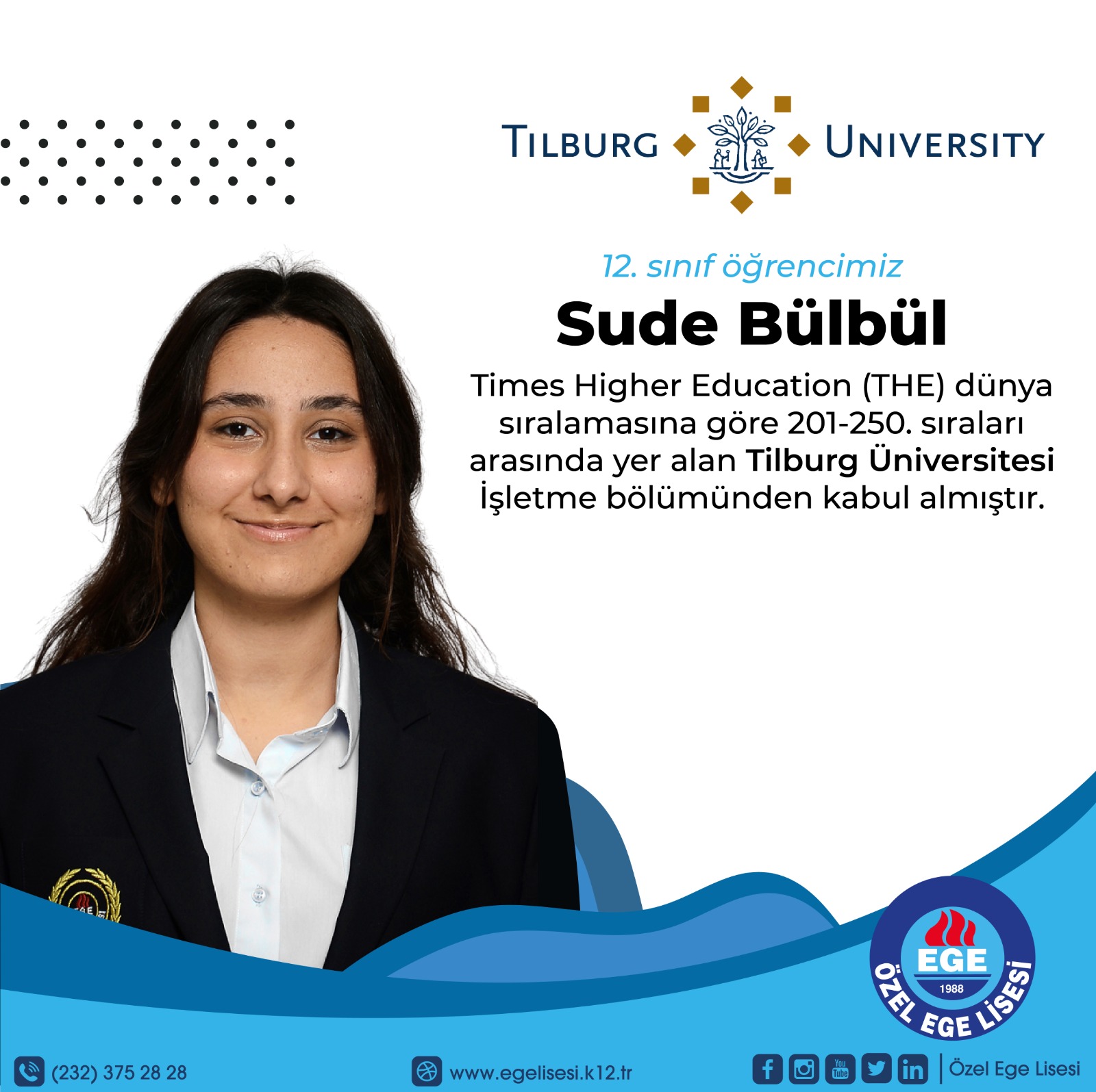 12.sınıf öğrencimiz Sude Bülbül, Times Higher Education (THE) dünya sıralamasına göre 601-800 sıraları arasında yer alan Oxford Brookes Üniversitesinin İşletme ve Uluslararası İş Yönetimi bölümlerinden ve 201-250 sıraları arasında yer alan Tilburg Üniversitesinin İşletme bölümünden kabul almıştır.